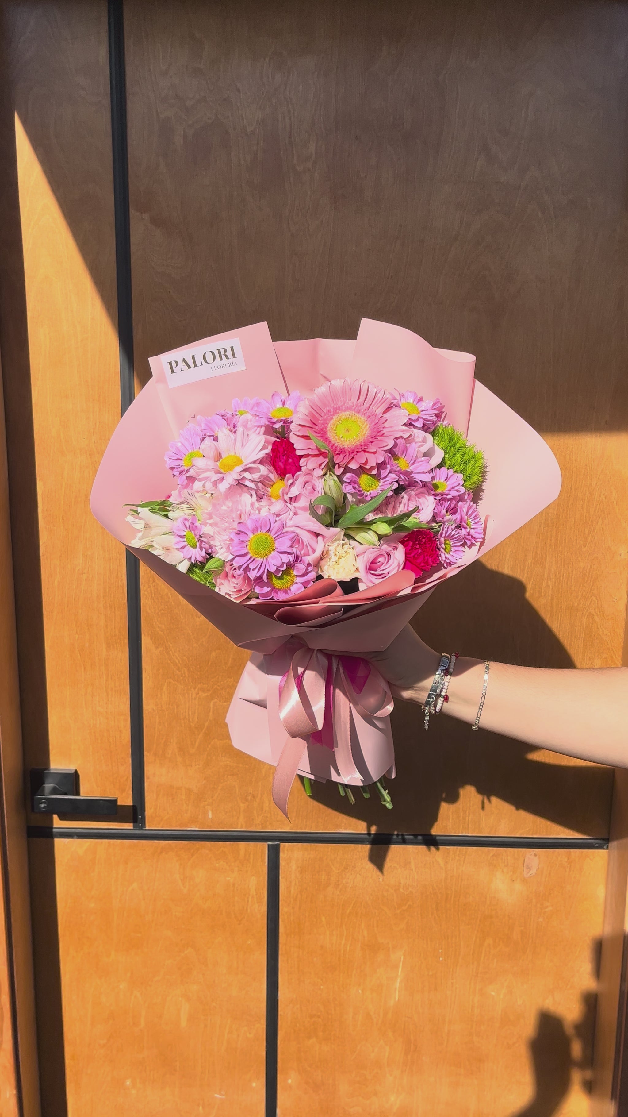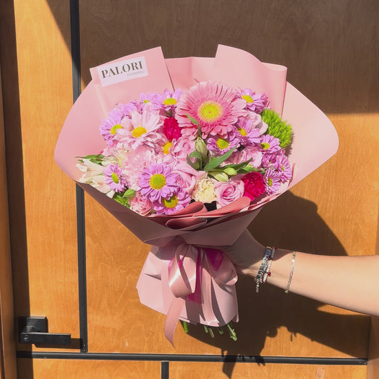 🌸 Flores: 10 rosas rositas, 1 gerbera rosita, clavel, inmortal, astromelia y margarita.