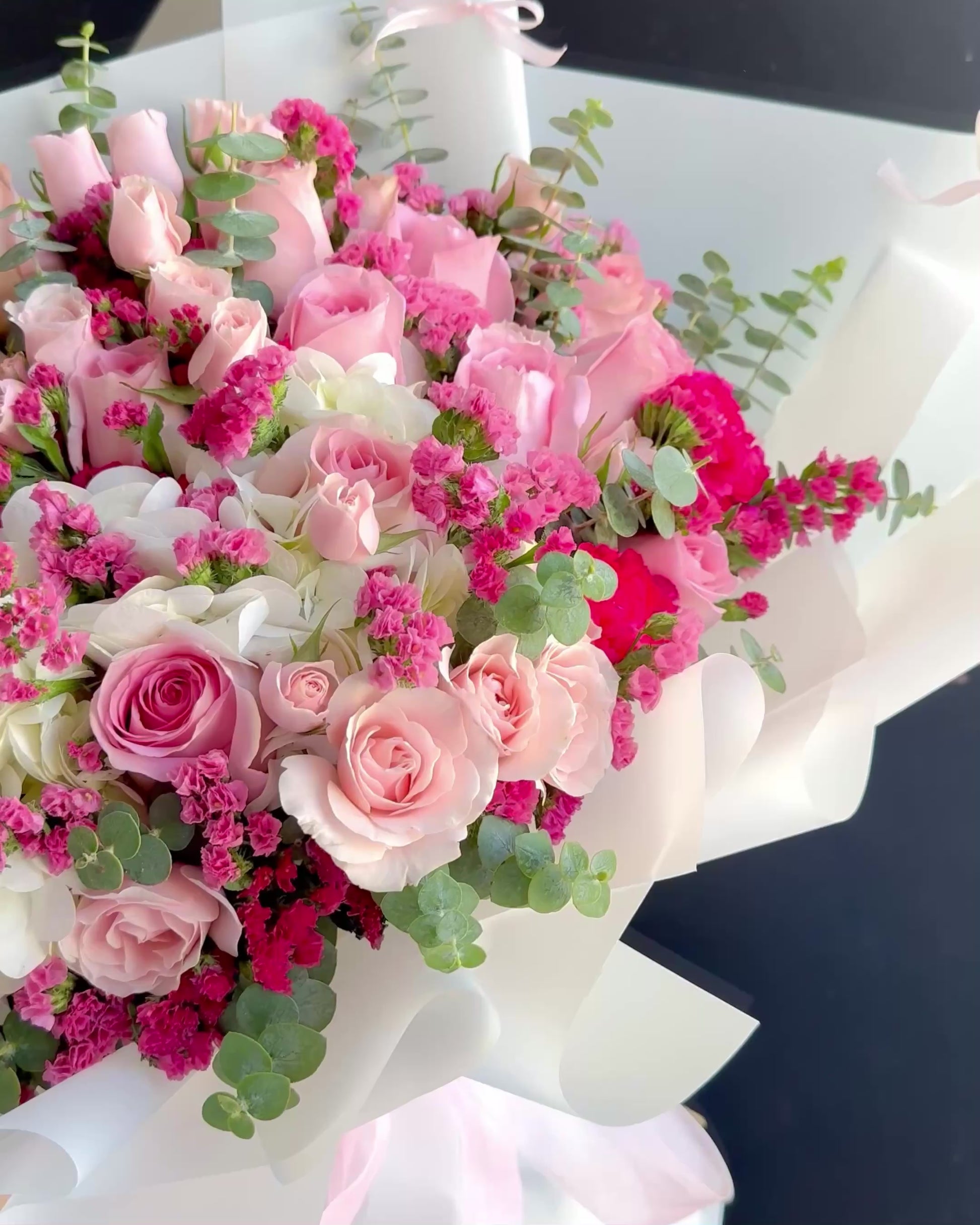 🌸 Flores: 24 rosas rositas, hortencia, mini rosa rosita, inmortal, dolar y clavel.